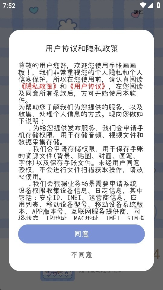 1、打开手帐画画板,阅读用户协议与隐私政策后,点击“同意”进入;
